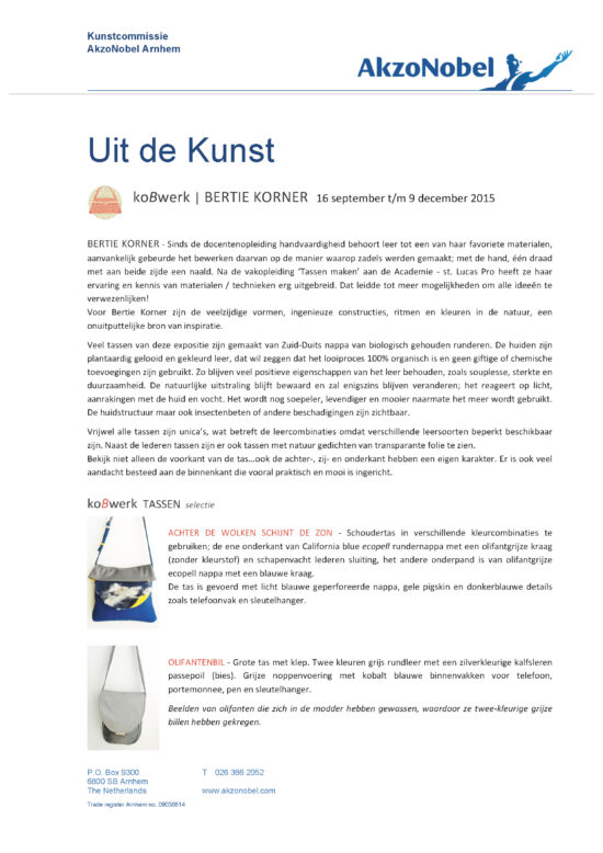 KunstWerk_op locatie presenteert > koBwerk | Bertie Korner TASSEN 16 september t/m 9 december 2015 koBwerk | BERTIE KORNER Sinds de docentenopleiding handvaardigheid behoort leer tot een vanBertie haar favoriete materialen. Aanvankelijk gebeurde het bewerken daarvan uitsluitend op de manier waarop zadels werden gemaakt; met de hand,