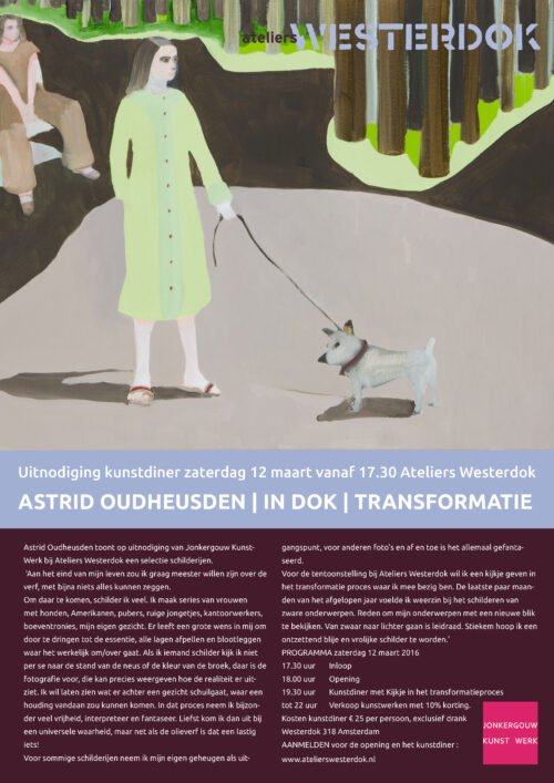 12 maart – 6 april 2016 kunstdiner & expositie bij Ateliers Westerdok Amsterdam Op uitnodiging van Jonkergouw KunstWerk exposeert Astrid Oudheusden bij Ateliers Westerdok. ‘Aan het eind van mijn leven zou ik graag meester willen zijn over de verf, met bijna niets alles kunnen zeggen. Om daar te komen, schilder ik veel. Ik maak se